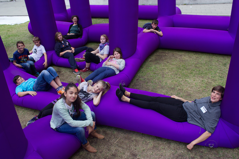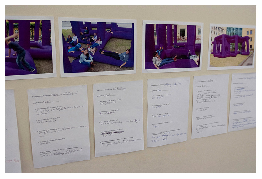 Jetzt war unser Raum voll, wir hatten keinen Platz mehr. Wir mussten ausweichen. Draußen im Hof des Podewils war eine Hüpfburg aufgebaut. Ein toller Ort! Wir fanden in ihm ziemlich genau das was gerade gebraucht wurde: ein Spielplatz mit Wolken zum ausruhen. Die Kinder beschrieben den Ort folgendermaßen: „Es ist ein Tempel mit Säulen, die mit Luft gefüllt sind und er ist groß und lila. Ich denke, ich bin im 7. Himmel, wenn ich auf der Hüpfburg springen und Pause machen kann. Wir spielen Fangen, Hüpfen, Wegschubsen und mit unseren Handys.“
