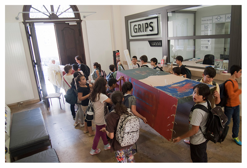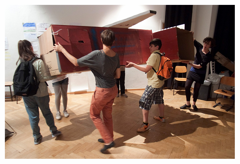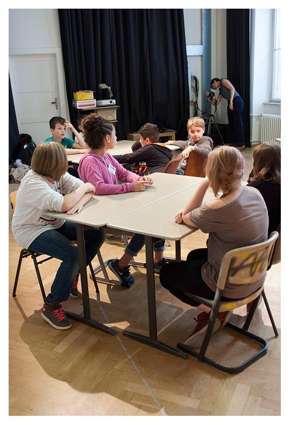 Du hast keinen Platz im Klassenzimmer! Mit dieser These begann unsere Arbeit in unserer Versuchsschule im Podewil. Gemeinsam bauten wir in unserem Raum das Klassenzimmer nach, dass die Kinder aus ihrer Schule kannten. Mit richtigen Schultischen und -stühlen entstand einmal die Gruppentisch-Sitzordnung und dann die der klassischen zweier Tischreihen. Mit einer selbst entwickelten Versuchsordnung testeten wir die dadurch entstandenen Räume auf den eigenen Platz, auf Möglichkeiten für Heimlichkeiten, auf unbemerkten Blickkontakt und schnelles und verrücktes Bewegen. Wir fragten auch: Wie gut konntest du vergessen, dass um dich herum noch andere Menschen sind? Wir sammelten alle Ergebnisse auf einem großen Auswertungsbogen und überlegten: Wofür ist Platz im Klassenzimmer? Und wofür ist kein Platz? Und: welche Art von Platz brauchst du, um dich wohlzufühlen?