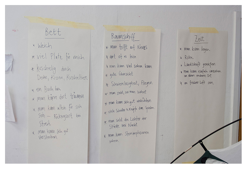 Was sind das für Orte, an denen sich unterschiedlichste Menschen wohlfühlen? Zusammen blätterten wir den Raumkatalog der Wohlfühl-Orte durch und trafen unter anderem auf ein Zelt, das auf einer Sommerwiese aufgeschlagen steht, ein Raumschiff auf seinem Weg durchs Weltall, einen Swimming-Pool, den Fernsehturm und eine Höhle versteckt im Wald.