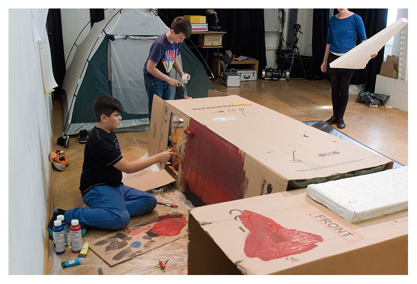 Um einen Ort ordentlich zu testen muss man sich an diesem befinden. Wir entschieden also drei Orte in unser Versuchsklassenzimmer zu holen: das Zelt stand ja schon, eine versteckte Höhle und ein Raumschiff sollten gebaut werden. Einen ganzen Tag schnitten wir Kartons zurecht, gruben Tunnel aus, strichen Außenwände in der richtigen Farbe (der Tunnel zur Höhle in gedeckten braun/grün Tönen, das Raumschiff in einem knalligen rot) und entwarfen ein Steuerbord und einen Turbinenantrieb. Zuletzt integrierten wir das Zelt in die Höhlenlandschaft, einem Wurzelgewächs, einem Fuchsbau ähnlich unter der Erde.